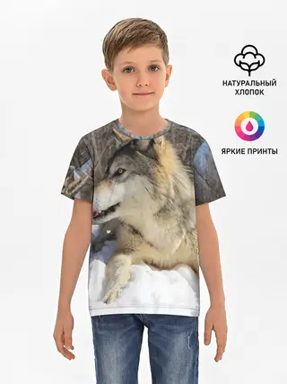 Детская базовая футболка / Волк лежит на снегу