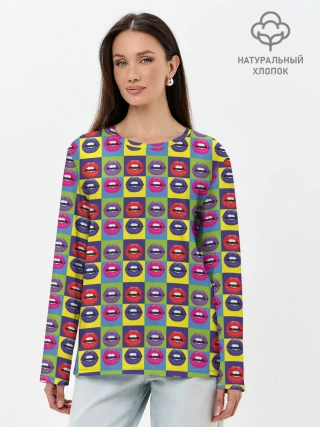 Лонгслив женский. Хлопок / Губы. Поп-арт
