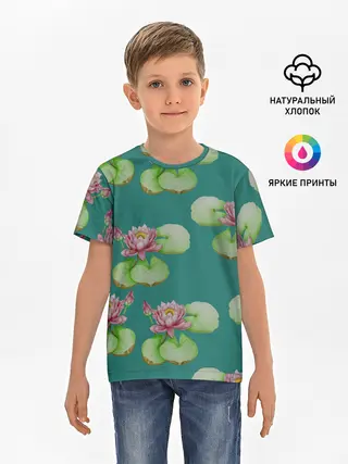 Детская базовая футболка / Лотосы на темно бирюзовом фоне