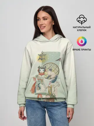 Женское худи / девушка кимоно зима Япония кот