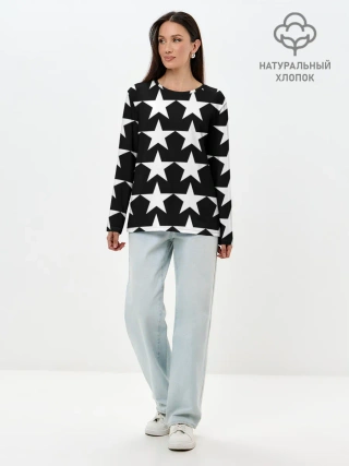 Лонгслив женский. Хлопок / Белые звёзды на чёрном фоне