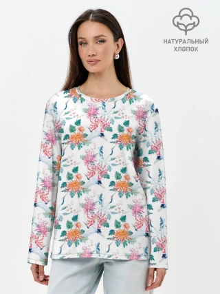 Лонгслив женский. Хлопок / Журавли и хризантемы