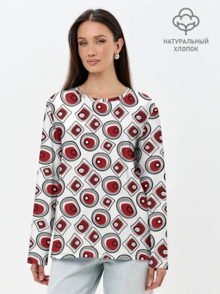 Лонгслив женский. Хлопок / Красно черный узор на белом