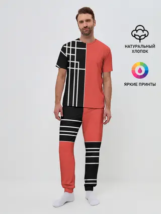 Мужская пижама с брюками / Черный и коралловый арт деко