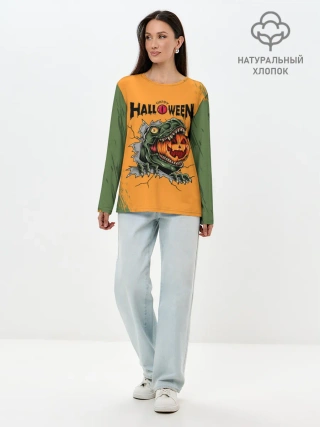Лонгслив женский. Хлопок / Т-Рекс с тыквой в пасте | Хэллоуин