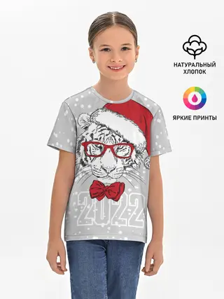 Детская базовая футболка / Белый тигр в шапке Санты
