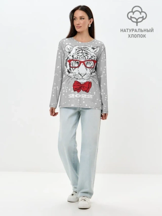 Лонгслив женский. Хлопок / Белый тигр с красным бантом