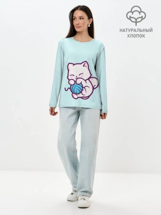Лонгслив женский. Хлопок / Белый котенок с клубком милый