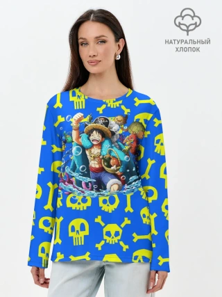 Лонгслив женский. Хлопок / Веселый Монки. Синий фон череп и кости