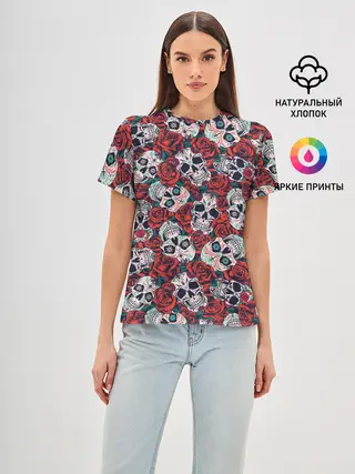 Женская базовая футболка / Тату черепа и розы