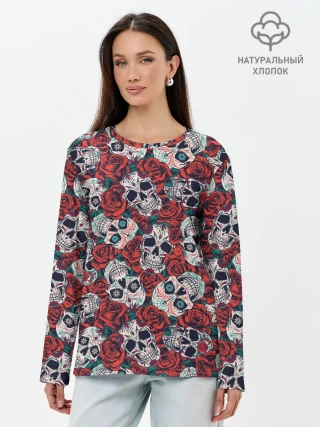 Лонгслив женский. Хлопок / Тату черепа и розы