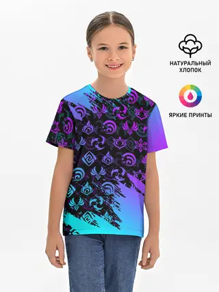 Детская базовая футболка / GENSHIN NEON PATTERN SYMBOL / НЕОН ЭМБЛЕМЫ