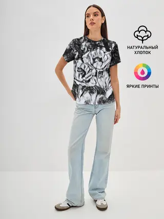 Женская футболка оверсайз / Черно-белый узор. Маки.