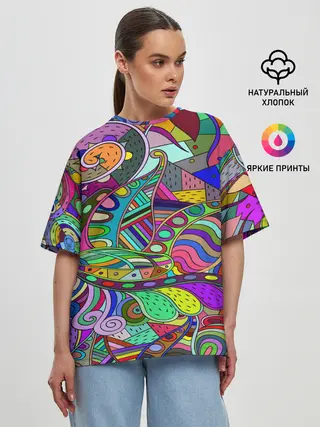 Женская футболка оверсайз / Дудлы узор разноцветный хиппи