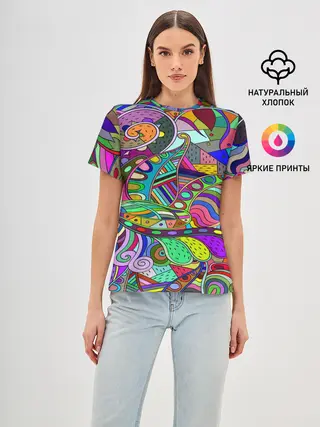 Женская базовая футболка / Дудлы узор разноцветный хиппи