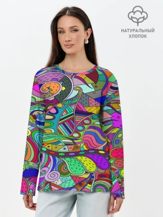 Лонгслив женский. Хлопок / Дудлы узор разноцветный хиппи