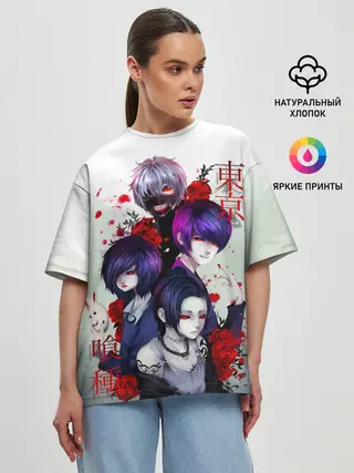 Женская футболка оверсайз / Канеки с девчонками - Токийский гуль