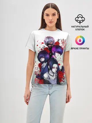 Женская базовая футболка / Канеки с девчонками - Токийский гуль