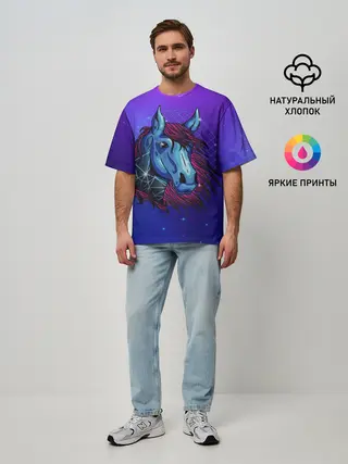 Мужская футболка оверсайз / Retrowave Neon Horse