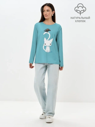 Лонгслив женский. Хлопок / Белый котик и воробушек