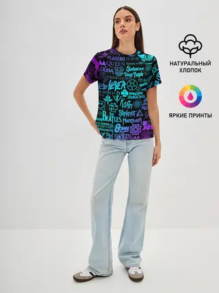 Женская футболка оверсайз / ЛОГОТИПЫ РОК ГРУПП НЕОН