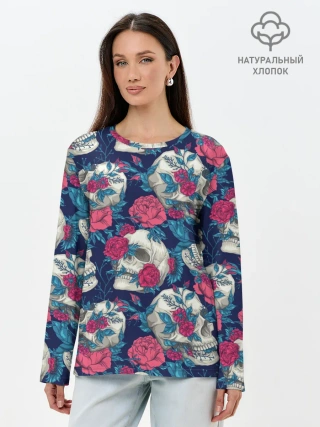 Лонгслив женский. Хлопок / Реалистичные черепа с розами