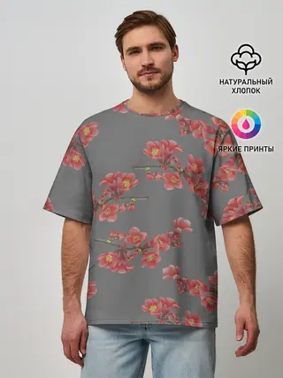 Мужская футболка оверсайз / Цветы айвы на сером фоне