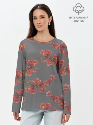 Лонгслив женский. Хлопок / Цветы айвы на сером фоне