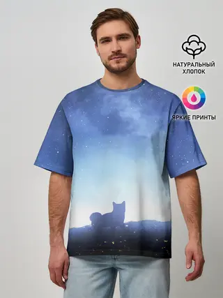 Мужская футболка оверсайз / силуэт корги ночь космос дымка