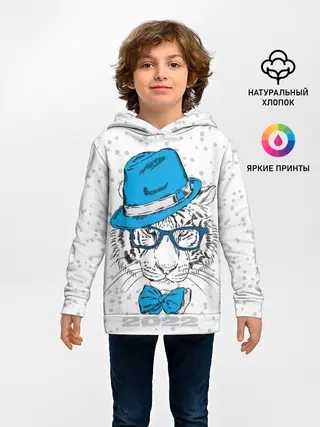 Худи мужской база хлопок / Белый тигр в синей шляпе