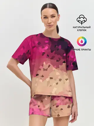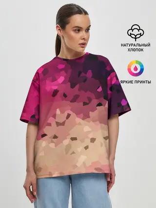 Женская футболка оверсайз / Бежево-малиновый абстрактный