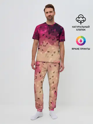 Мужская пижама с брюками / Бежево-малиновый абстрактный