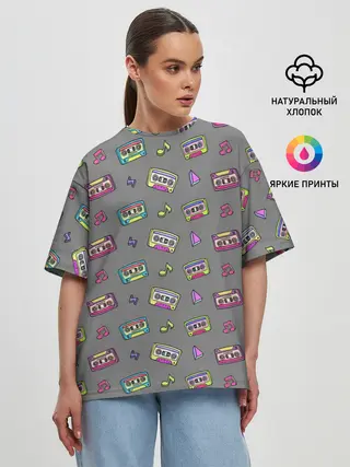 Женская футболка оверсайз / Касеты и ноты