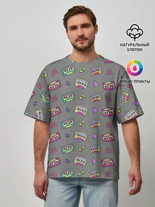 Мужская футболка оверсайз / Касеты и ноты