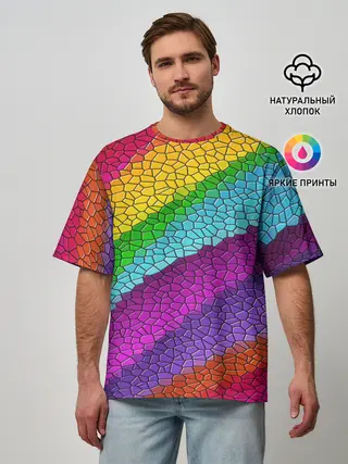 Мужская футболка оверсайз / Яркая мозаика радуга диагональ