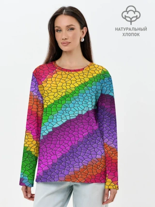 Лонгслив женский. Хлопок / Яркая мозаика радуга диагональ