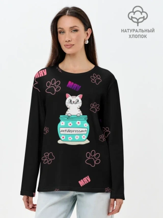 Лонгслив женский. Хлопок / Котик-антидепрессант