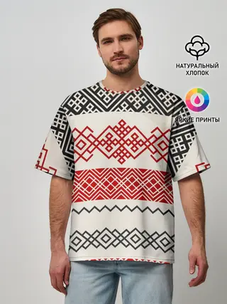 Мужская футболка оверсайз / Славянский узор красно-черный