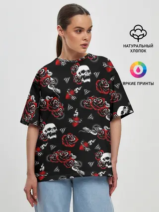 Женская футболка оверсайз / Черепа и розы