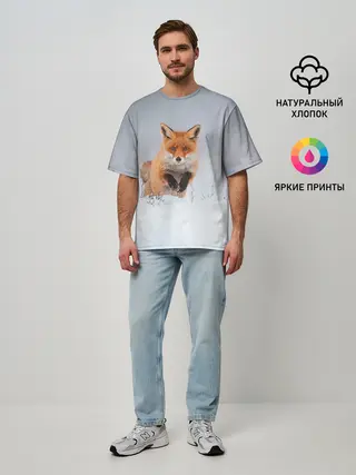 Мужская футболка оверсайз / Лисица прыгает по снегу