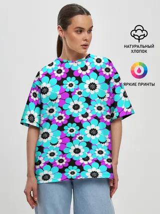 Женская футболка оверсайз / Яркие бирюзовые цветы