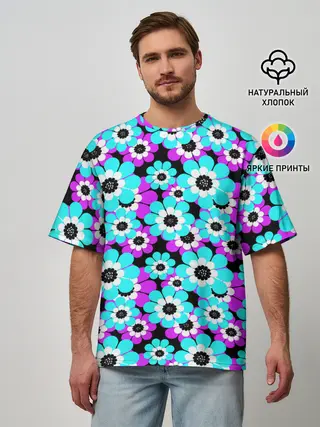 Мужская футболка оверсайз / Яркие бирюзовые цветы