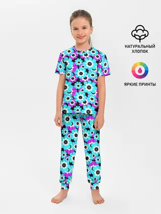 Детская пижама с брюками / Яркие бирюзовые цветы