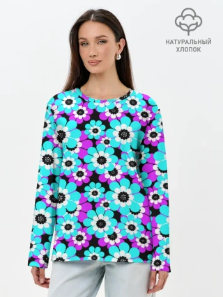Лонгслив женский. Хлопок / Яркие бирюзовые цветы