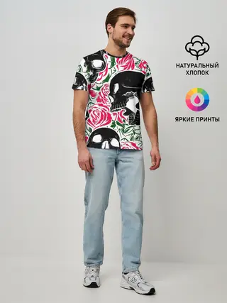 Мужская базовая футболка / Череп, розы, цветы, зубы