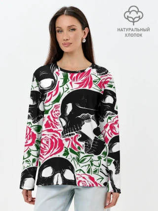 Лонгслив женский. Хлопок / Череп, розы, цветы, зубы