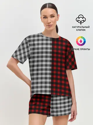 Женская пижама с шортами / Красно белая рубашка в клетку