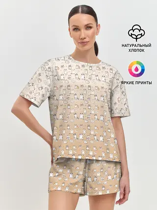Женская пижама с шортами / много котиков узор