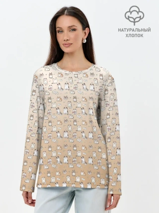 Лонгслив женский. Хлопок / много котиков узор