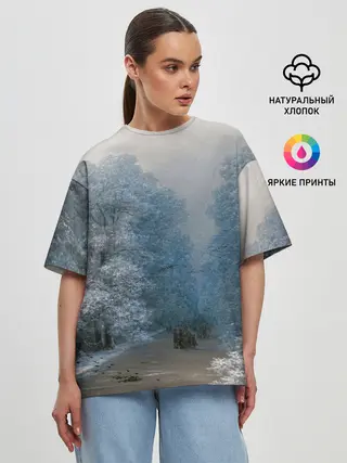 Женская футболка оверсайз / Зимний пейзаж картина маслом